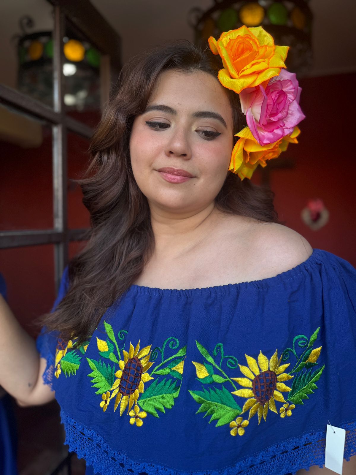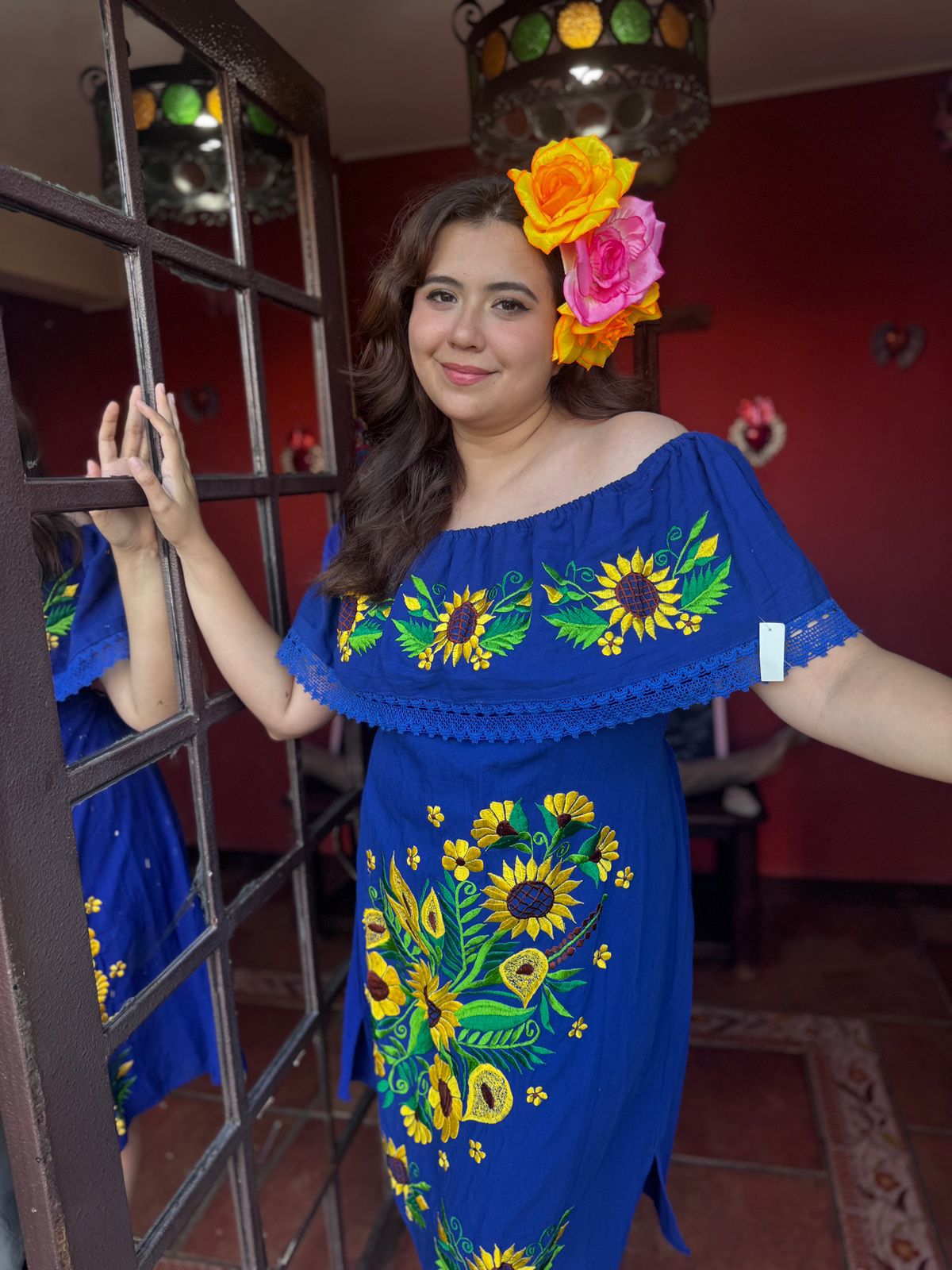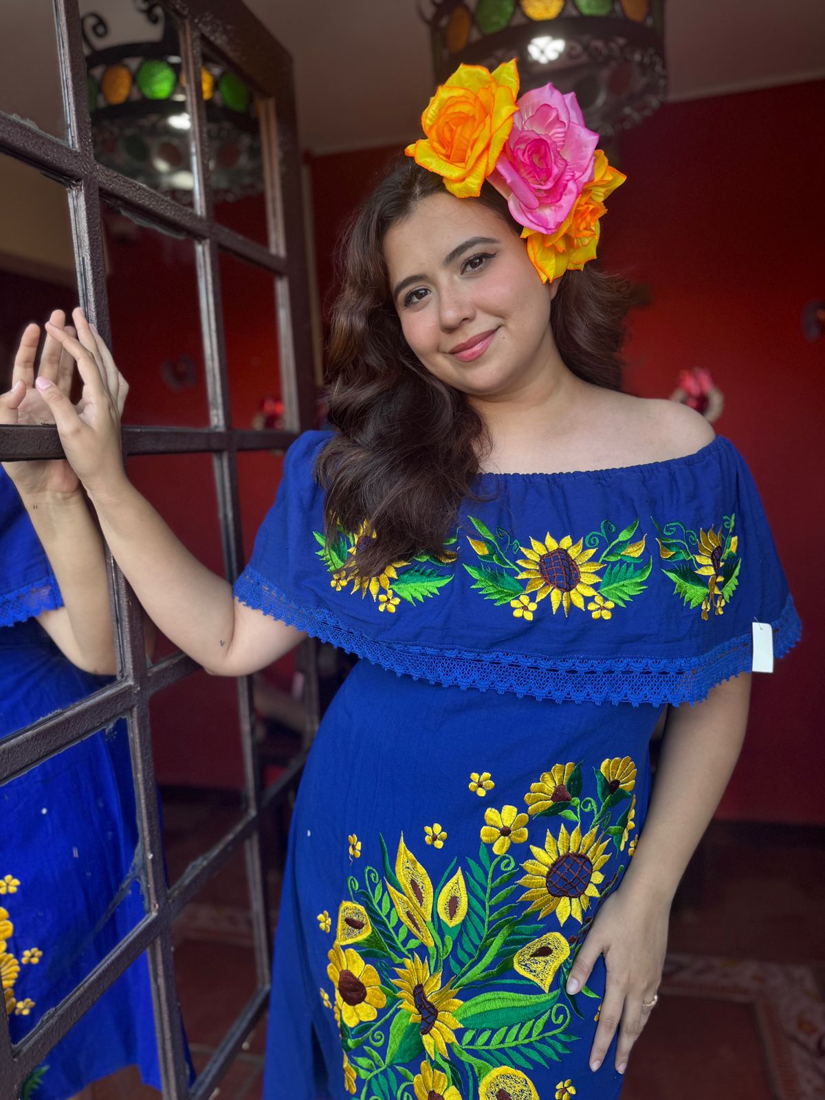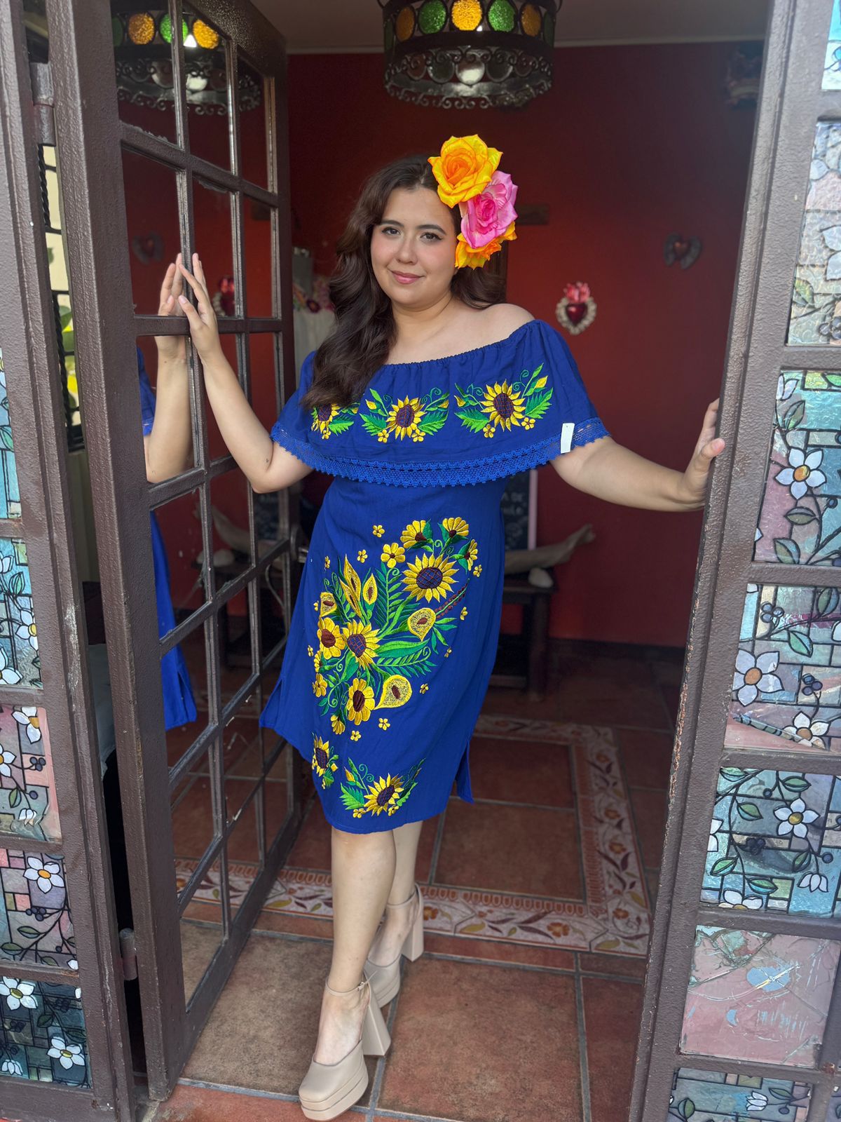 Vestido Semi-Largo , Azul bordado amarillo